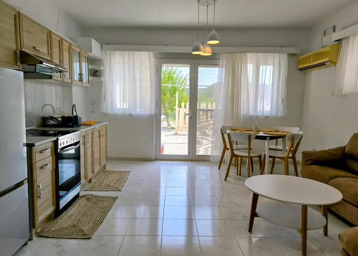 The apartment offers self-catering amenities, such as an equipped kitchenette, and an outdoor dining area for guests' convenience. The property opens onto a patio.